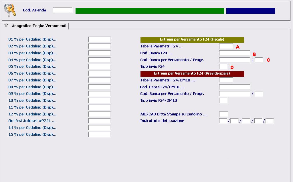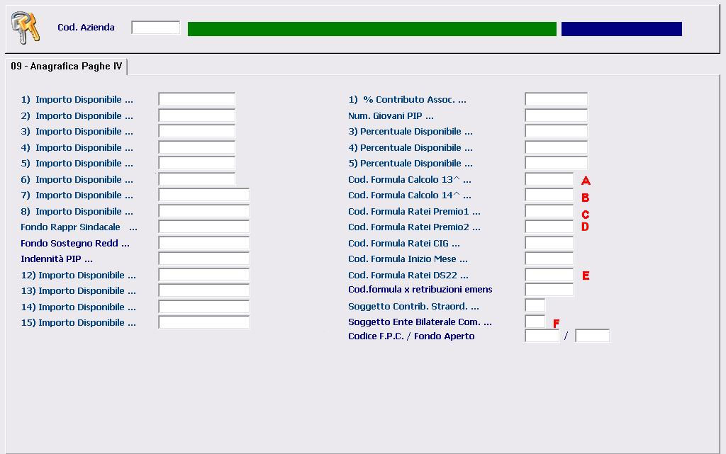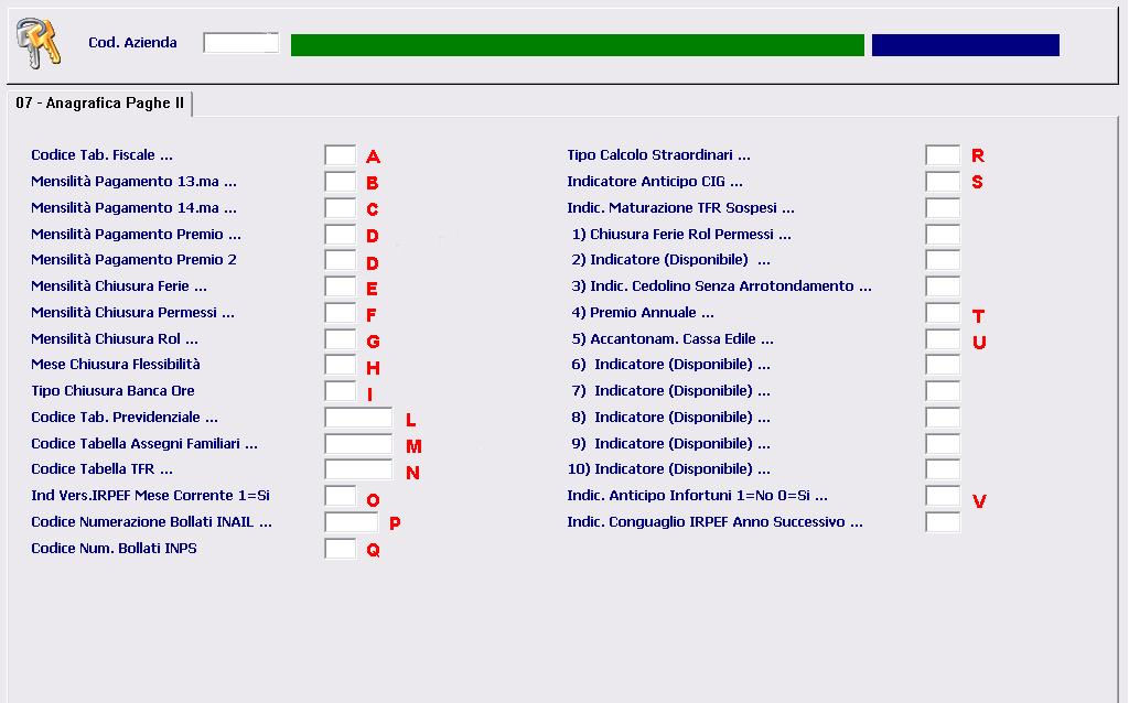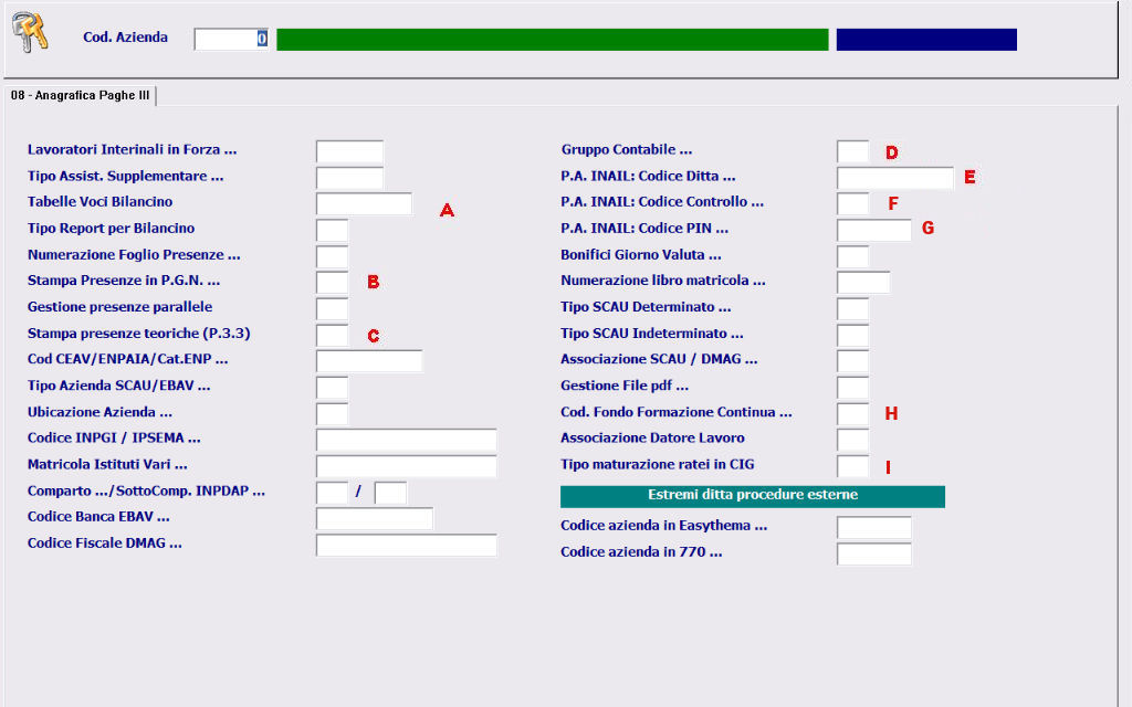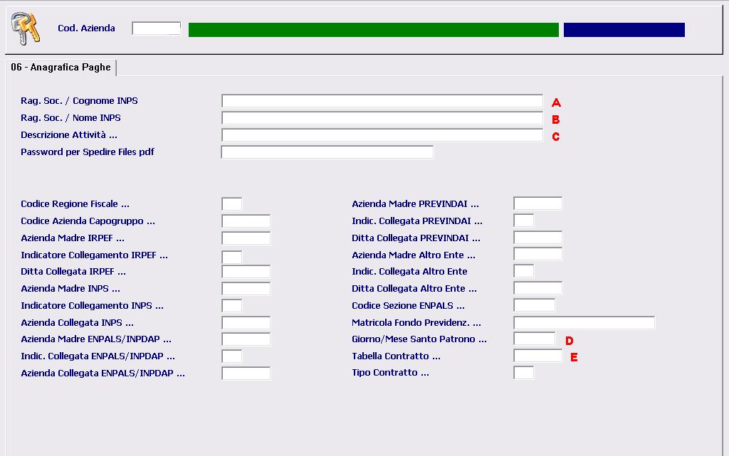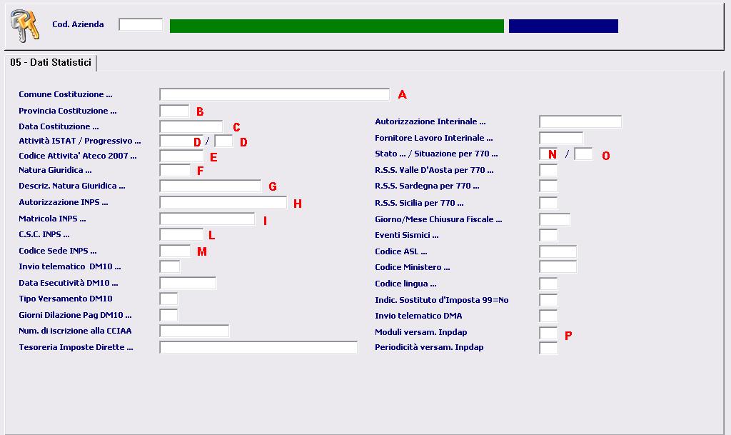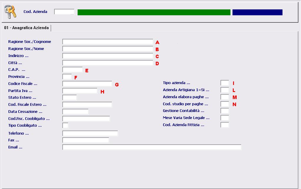 Di seguito elenchiamo i campi principali per il caricamento corretto di una ditta evidenziati nelle varie maschere con le lettere dell’alfabeto.