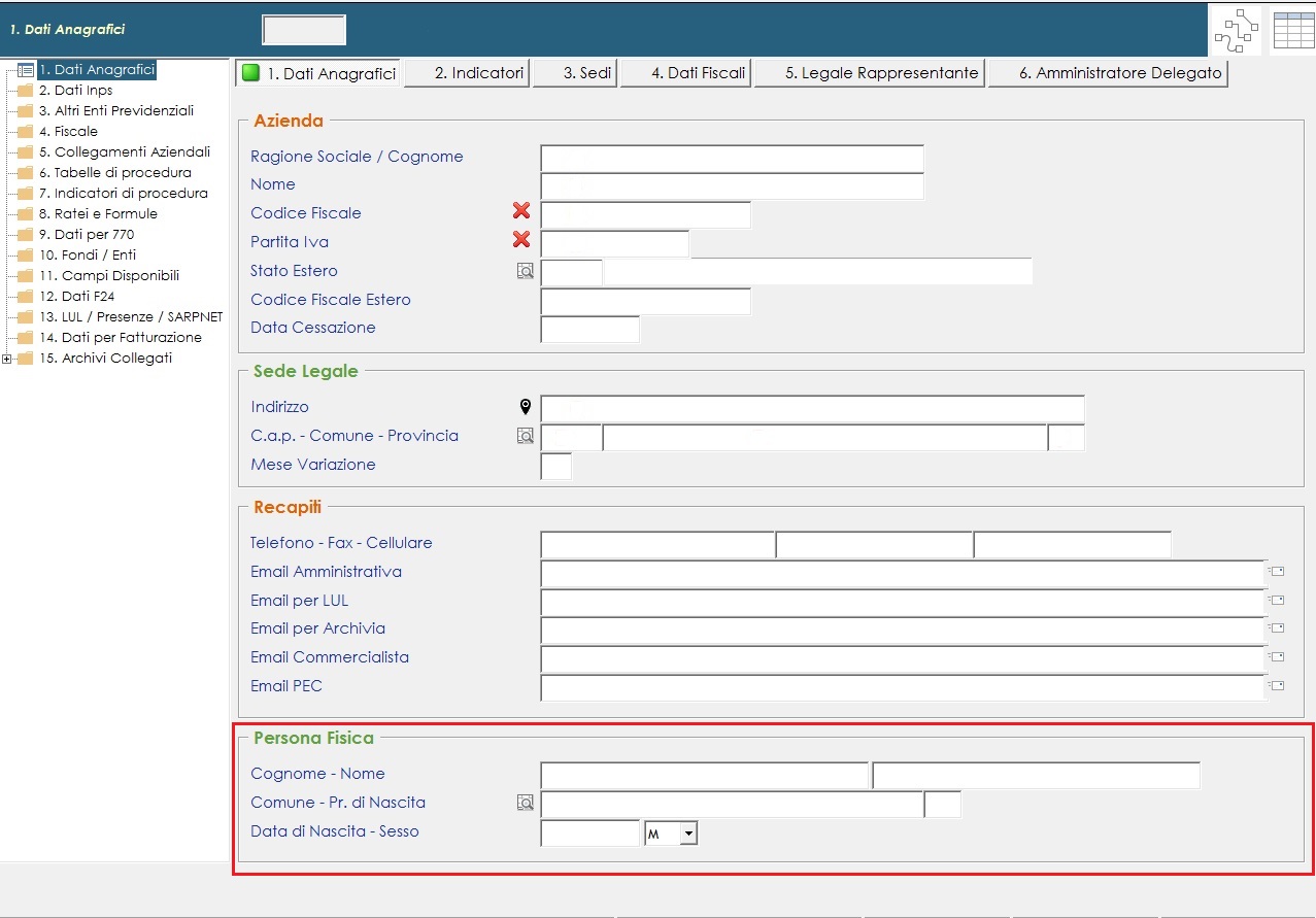 L'anagrafica ditta è composta da 13 maschere di cui le prime dieci riguardano i dati anagrafici, il domicilio fiscale e la sede di attività, il legale rappresentante e l’inquadramento dell’azienda.