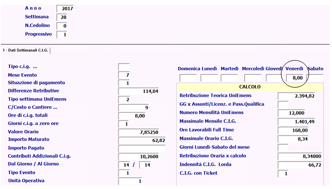 Nella parte di sinstra vengono corrette le differenze da accreditare per Cig ed eventualmente l'indicazione della copertura settimanale totale (X se intera settimana in Cig) o parzialmente coperta (2 se settimana parzialmente in Cig).