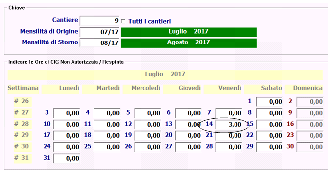 Supponiamo che, a fronte di una situazione presente in P.1.L. come quella sotto riportata, si debbano recuperare 3 delle 8 ore di Cig effettuata venerdì 14/07 in quanto respinte e che si voglia conguagliare il differenziale nel cedolino del mese di agosto.